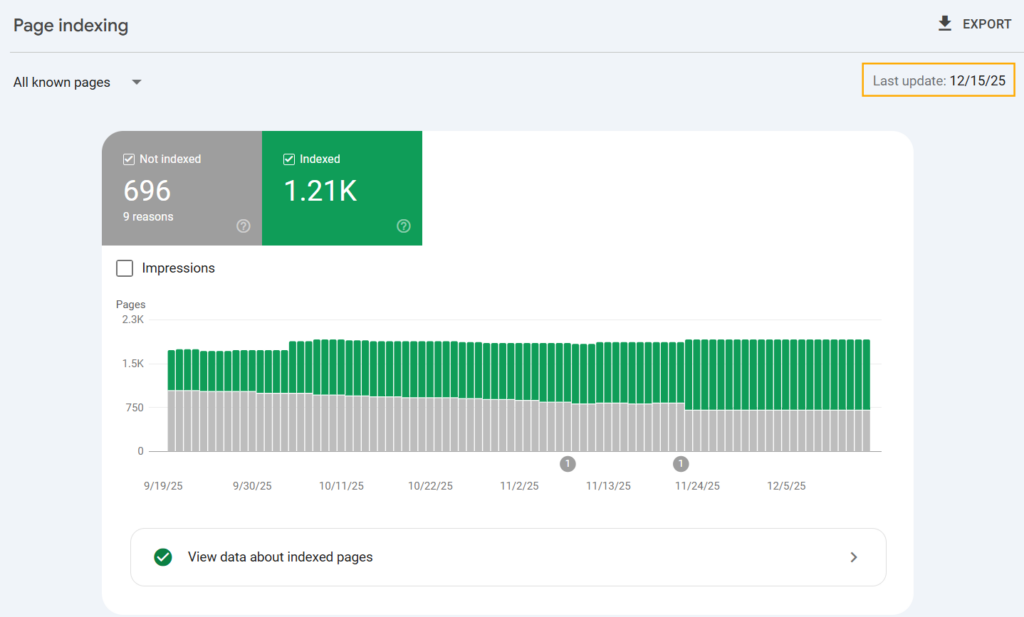 By mid December, users began reporting that the Page Indexing report had resumed updating normally. As of December 15, the data is now fully refreshed and aligned with real time indexing status. The Performance report has also returned to its usual update cadence.