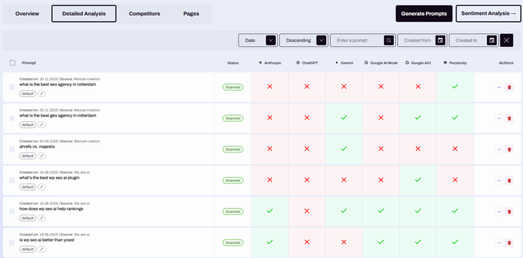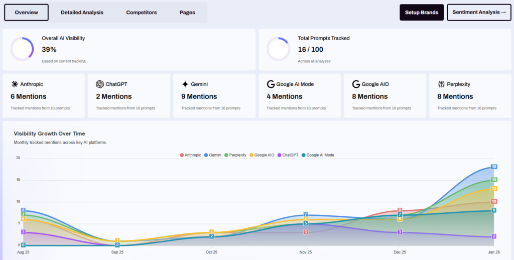 WP SEO AI’s Brand Visibility Tracker monitors your brand mentions across ChatGPT, Claude (Anthropic), Gemini, Perplexity, and Google AI Overviews.