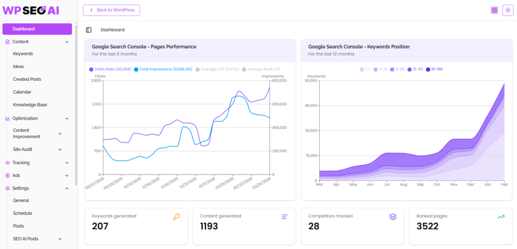 While the WP SEO Agent automates the heavy lifting like content creation and technical audits, seasoned SEO and GEO specialists refine strategy, monitor results, and step in whenever a human touch is needed. This fusion of AI SEO automation and expert support saves you 10+ hours weekly, lowers costs compared to traditional agencies, and delivers tangible gains you can share with your leadership team.