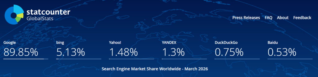 Google has by far the highest market share of any search engine. StatCounter’s March 2026 global figures put Google at 89.85%, with Bing in second place at 5.13%. No other search engine is currently close to challenging Google at worldwide scale.