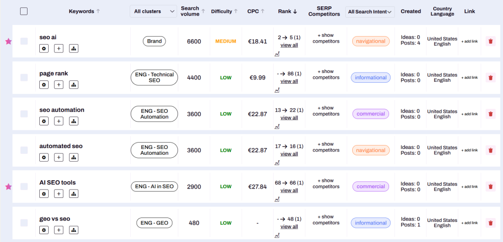Du kannst Suchvolumen, Keyword-Schwierigkeit, CPC und Intention analysieren und anschließend verfolgen, wie sich Deine Rankings im Zeitverlauf entwickeln. Mit integriertem Rank Tracking und SERP Wettbewerbs Insights, AI gestützter Keyword Generierung, Clustering Tools und erweiterten Filtern erhältst Du die volle Kontrolle über Deine SEO Roadmap.