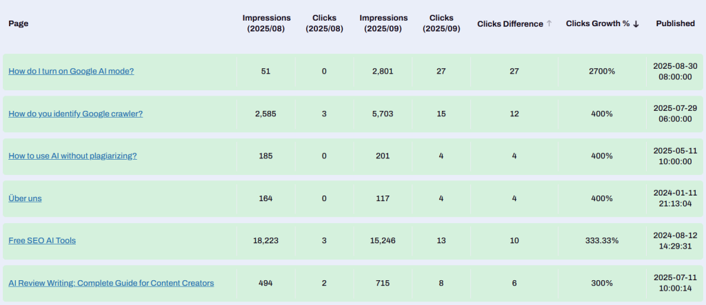 Dank integrierter Filter und Metriken wie Impressionen, Klicks, Klickwachstum und Performance-Unterschieden erkennst Du sofort SEO-Erfolge und Optimierungspotenziale. So stellst Du sicher, dass jede Seite wirksam zu den Gesamtzielen Deiner Website beiträgt.