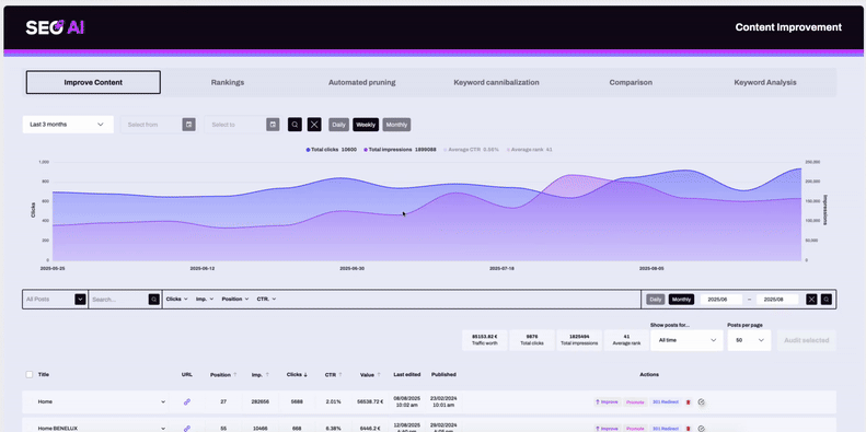 Met onze SEO-agent voor WordPress kunnen we content snel en efficiënt A/B-testen. Scoort versie A en levert het klikken op, dan blijven we deze optimaliseren. Presteert versie B minder, dan verwijderen we die, zodat er geen moeite verloren gaat. Het resultaat: betere resultaten, sneller, met tot wel 90% tijdsbesparing.
