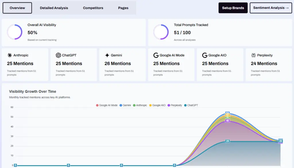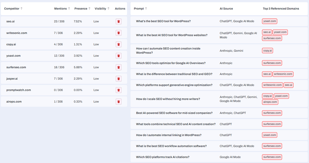 - Meerdere platforms tegelijk volgen: Alleen ChatGPT volgen is niet genoeg als jouw klanten ook Google AI Overview of Perplexity gebruiken.